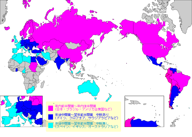 水色→年途中開幕~翌年前半閉幕 中断無し (スペイン、イギリス、オーストラリアなど)