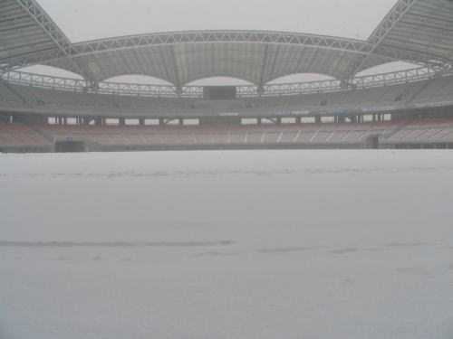 道路と違い機械作業にも限度が有ります。ピッチだけでなく観客席の除雪も必要で、そのすべてが手作業になります。積雪地に住んでみないと分からないことですが、除雪した雪を何処に捨てるかも問題になってきます。当然、除雪のためには膨大な費用が発生します。